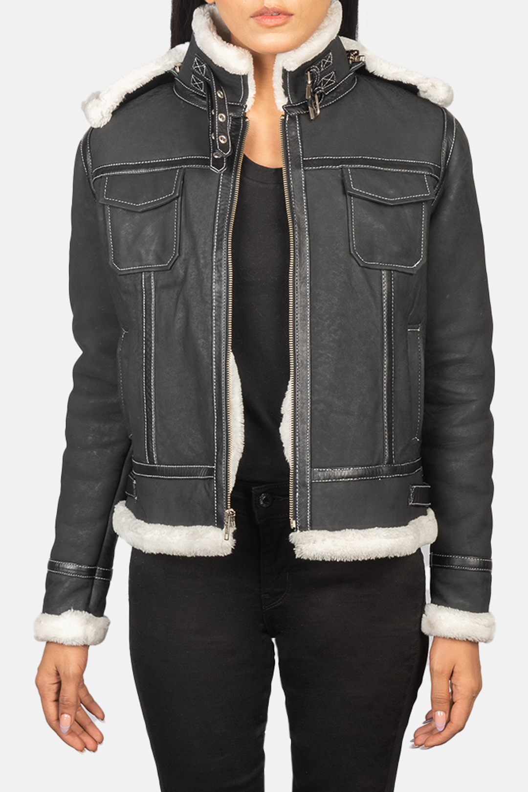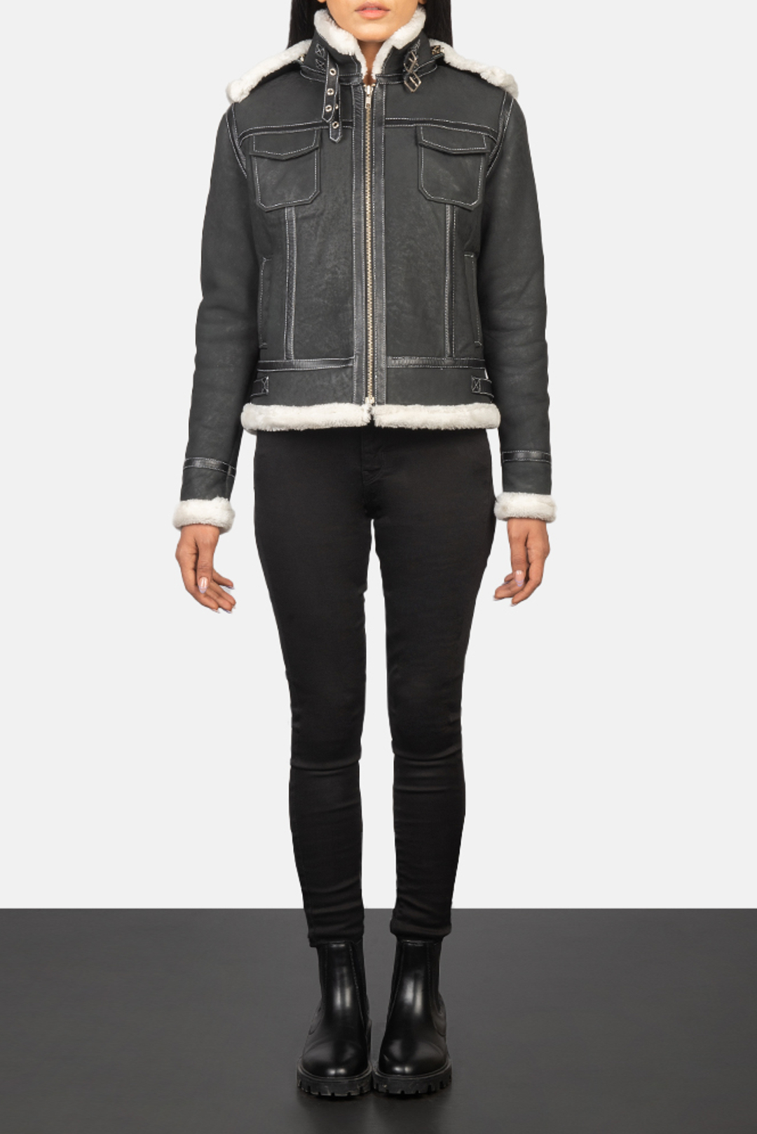 Fiona Black Hooded Shearling Leather Jacket