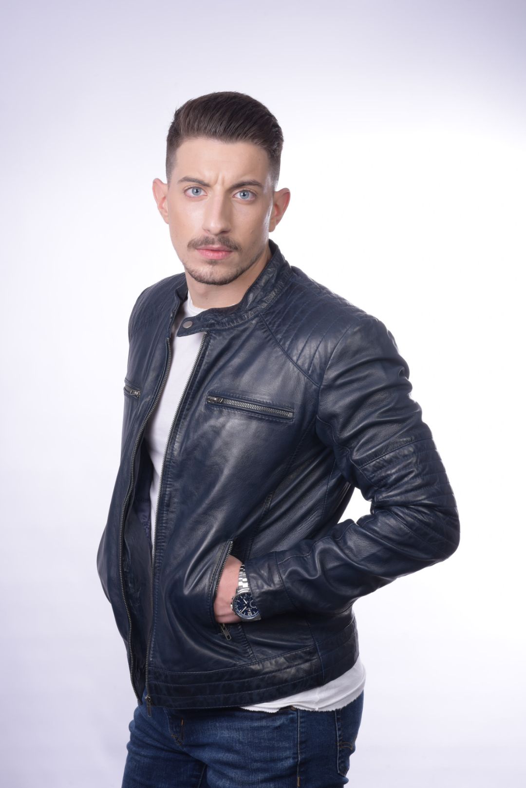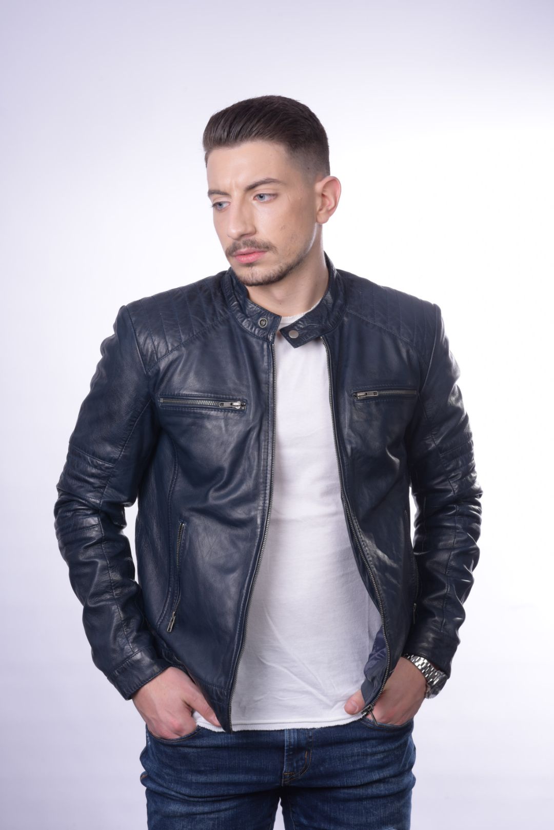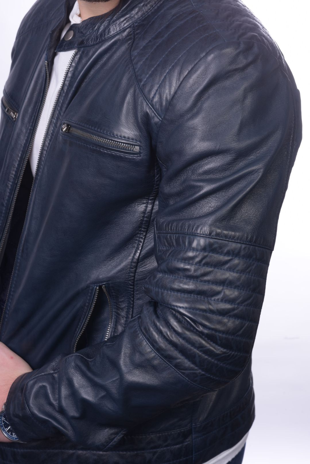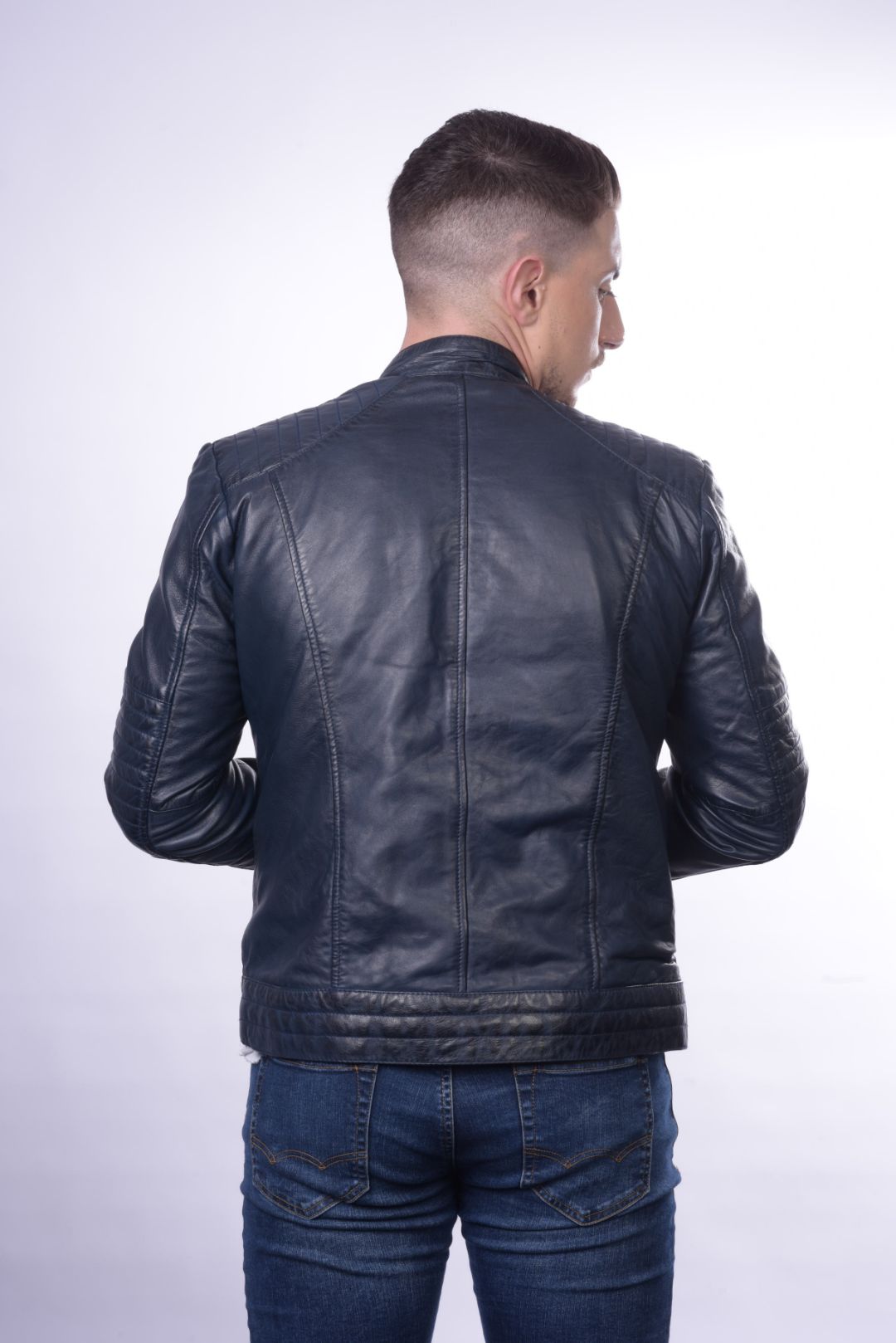 • Ανδρικό μπουφάν από γνήσιο αρνί δέρμα σε στενή γραμμή.