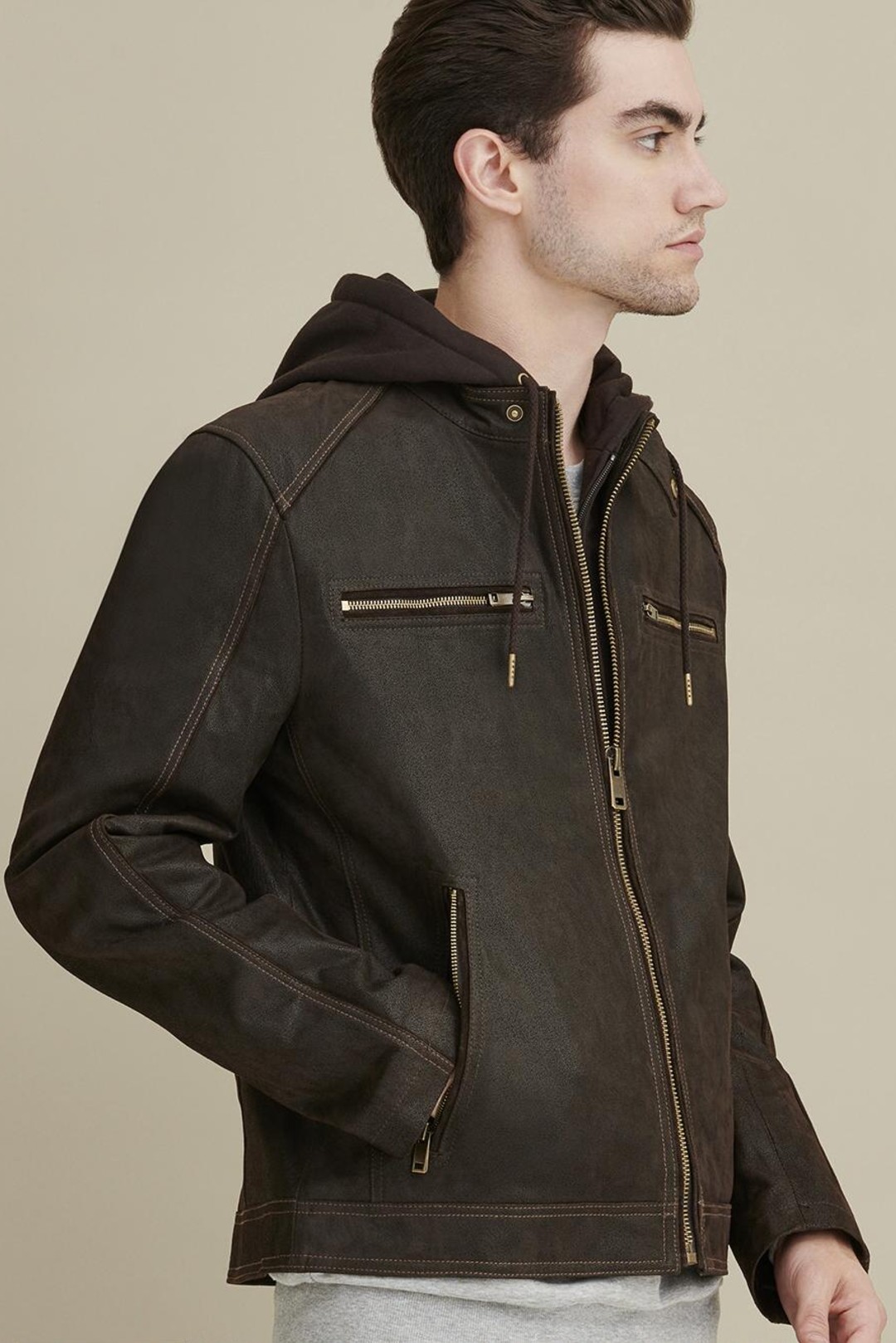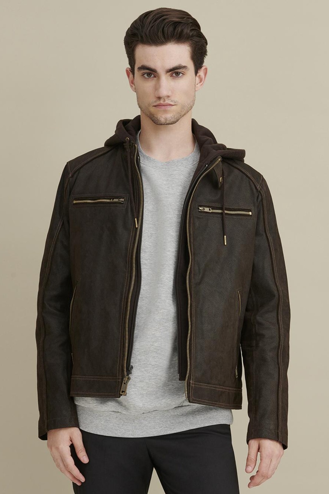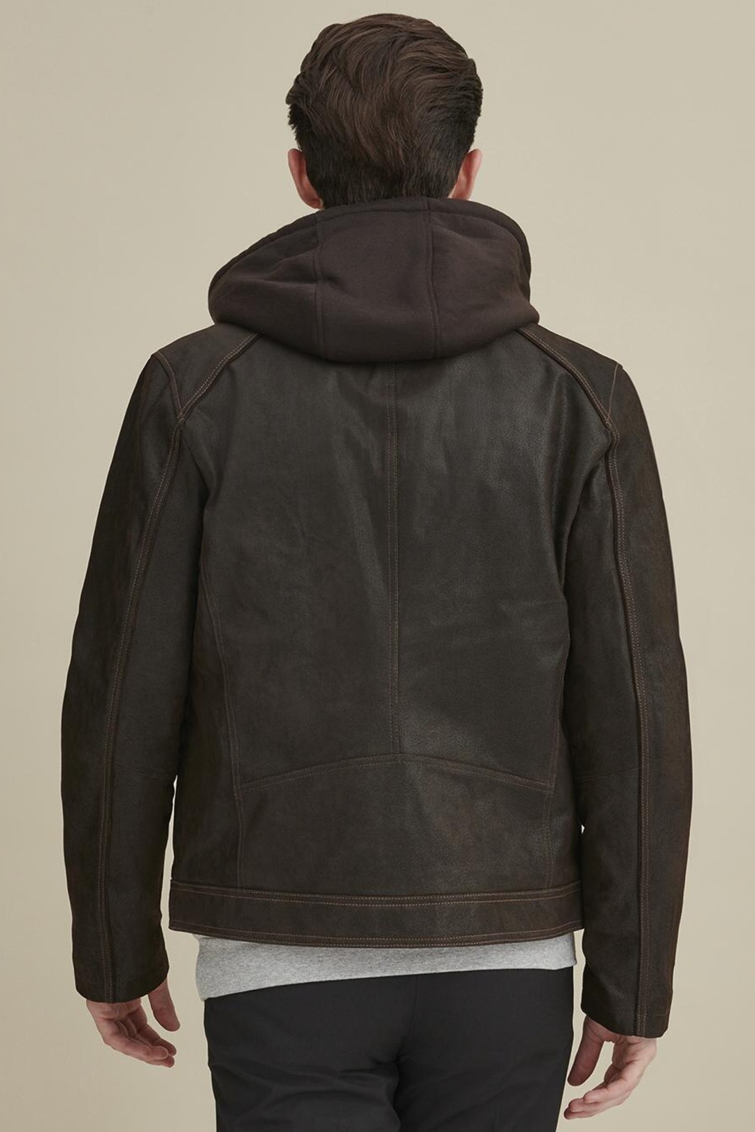 Online Only - Be ready for the open road with this vintage-inspired genuine leather moto jacket from Wilsons Leather. Features a zippered-in hooded storm collar and lots of zipper pockets for secured storage. A great look with jeans for any casual occasion. All our Wilsons Leather Vintage brand jackets have an ageless attitude and a slim, modern fit. Runs one size smaller than normal.