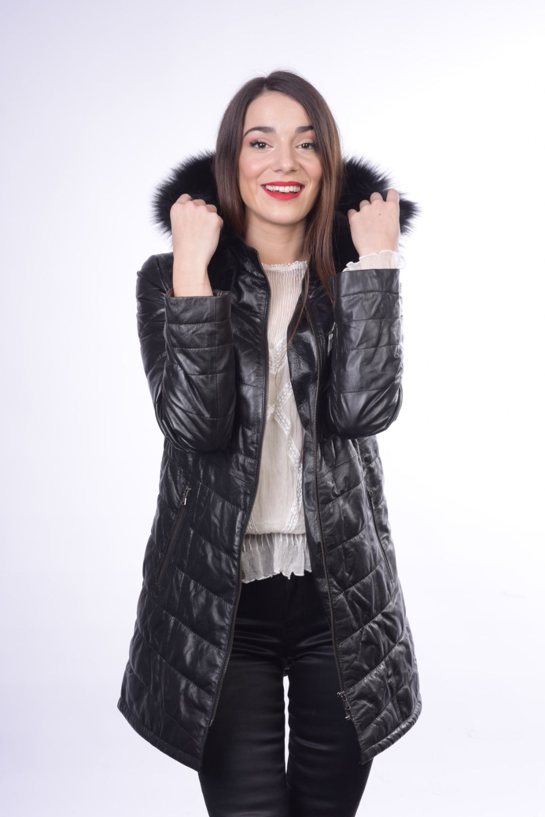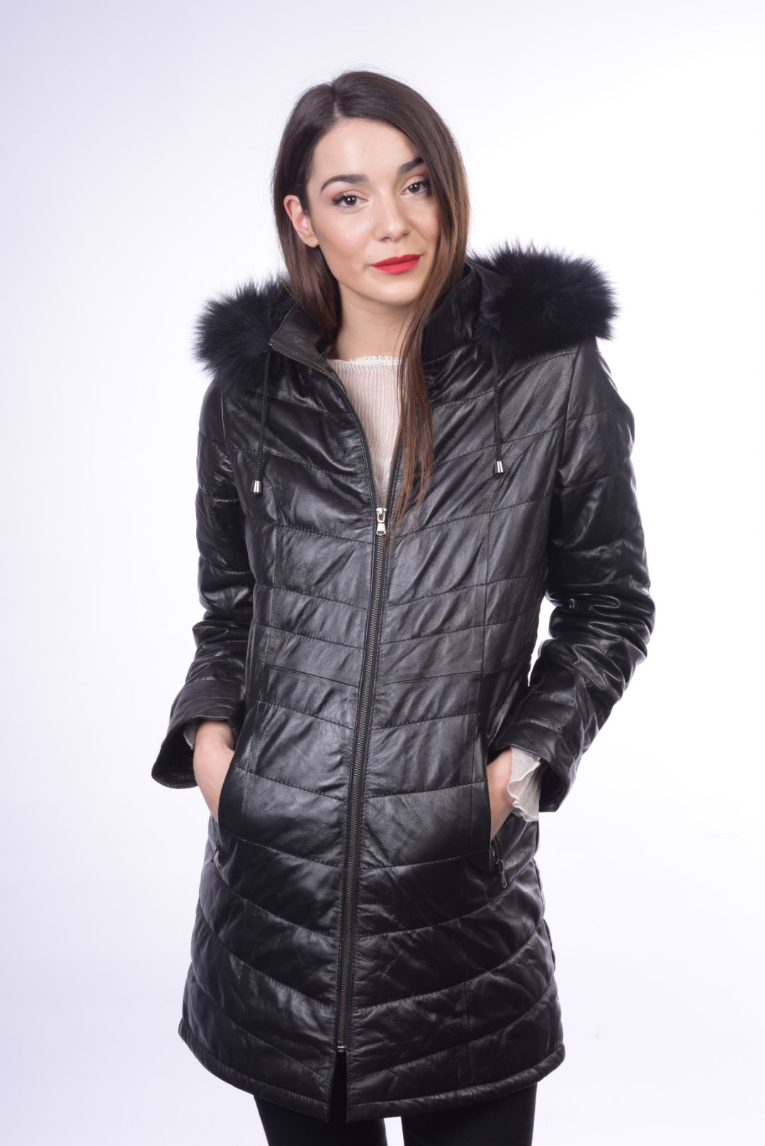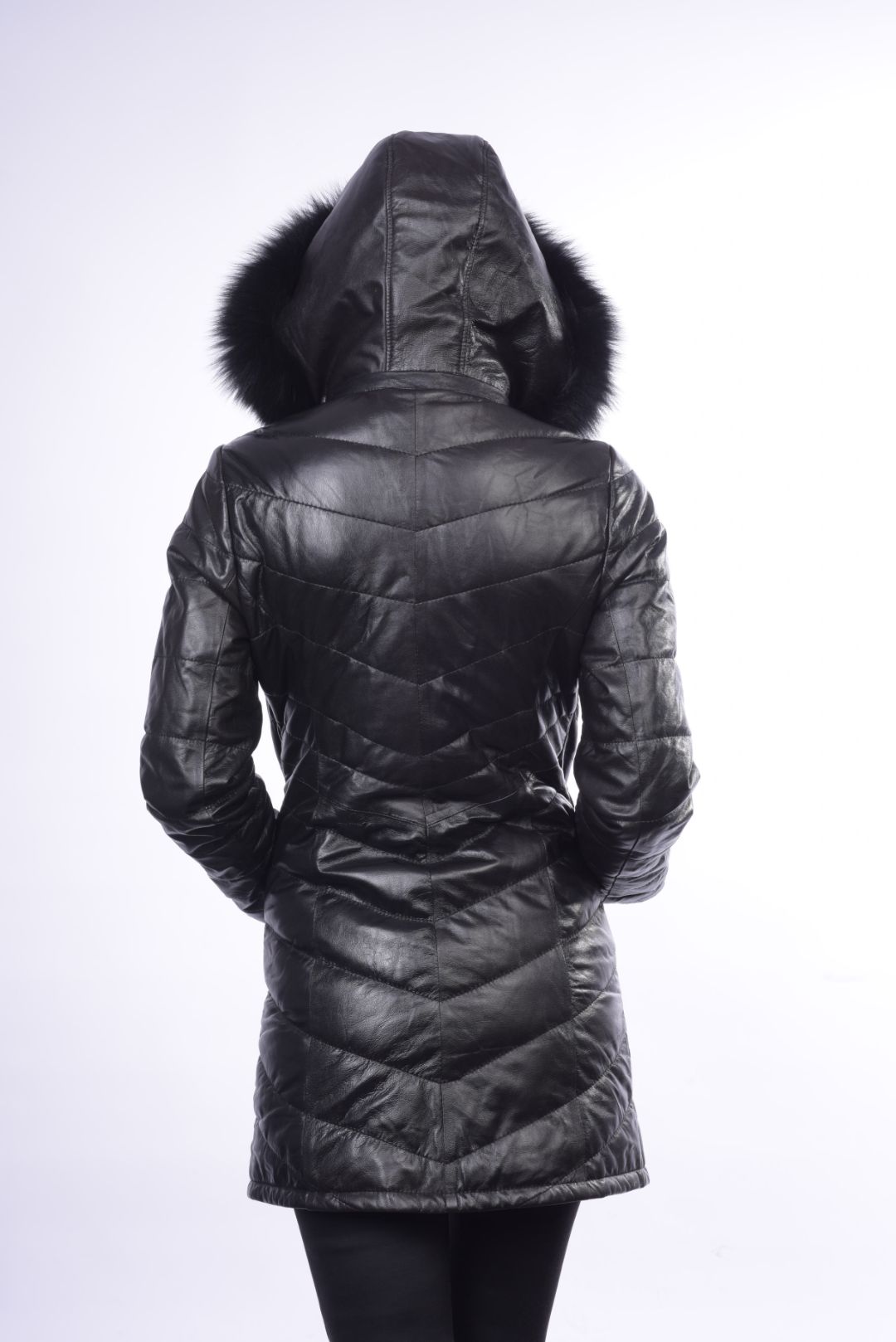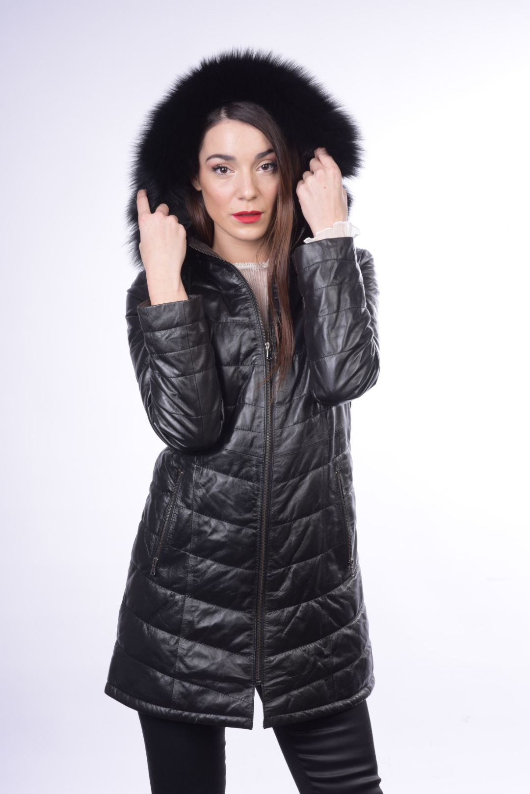 • Προσθαφαιρούμενη δερμάτινη κουκούλα με γούνα αλεπού στον γιακά.