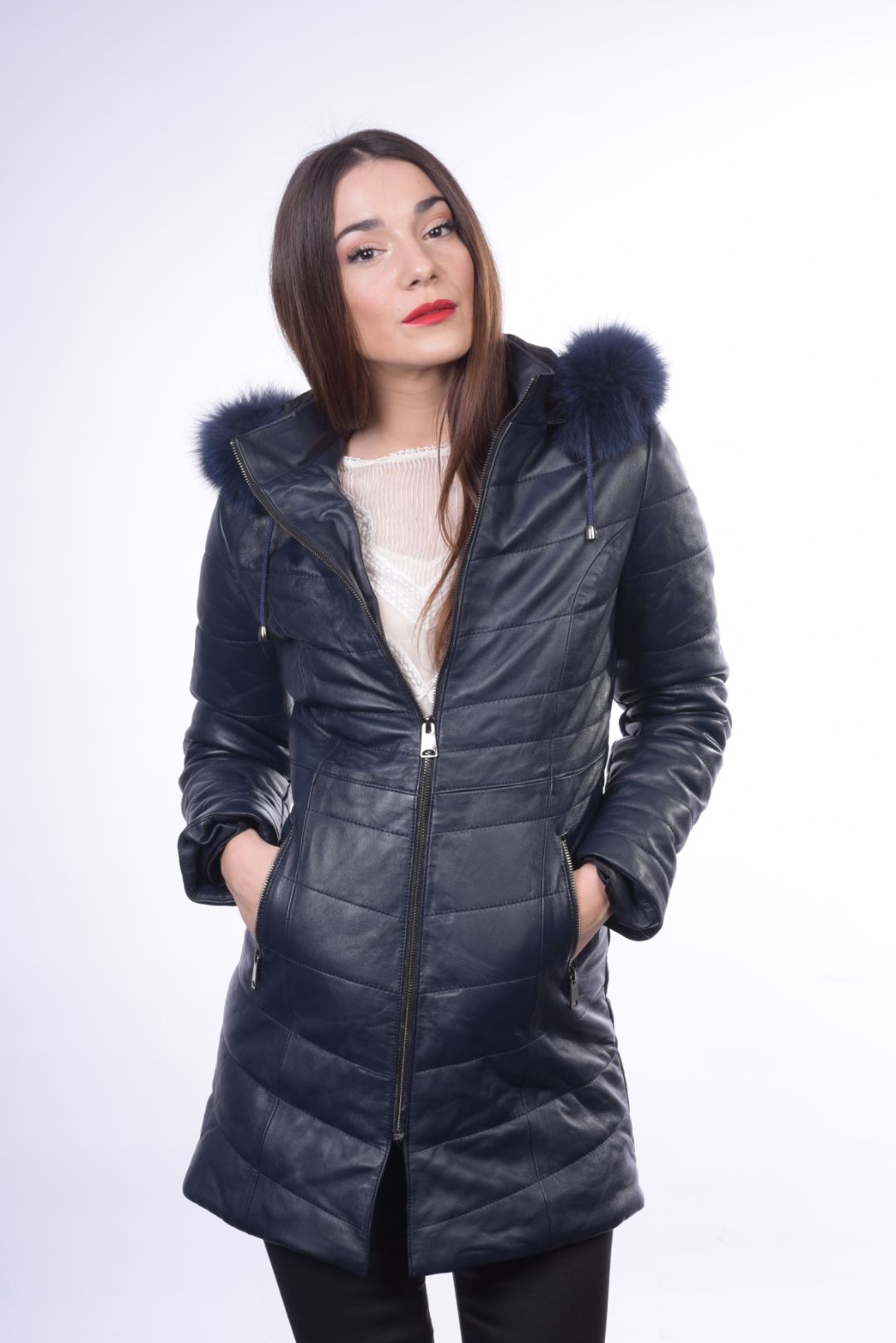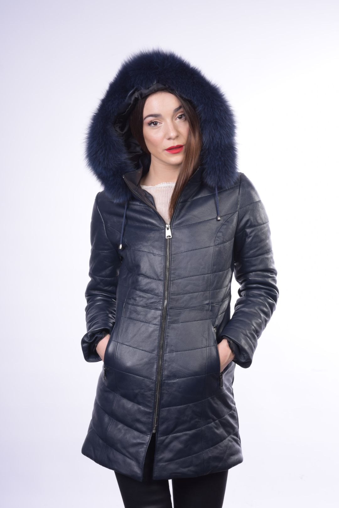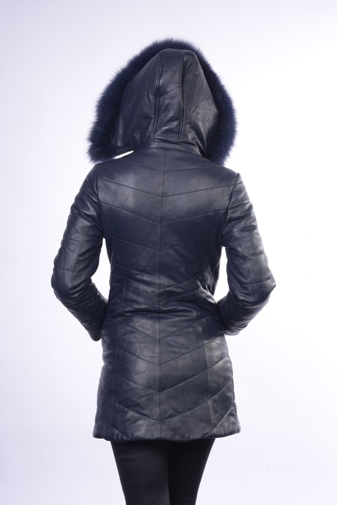 • Προσθαφαιρούμενη δερμάτινη κουκούλα με γούνα αλεπού στον γιακά.