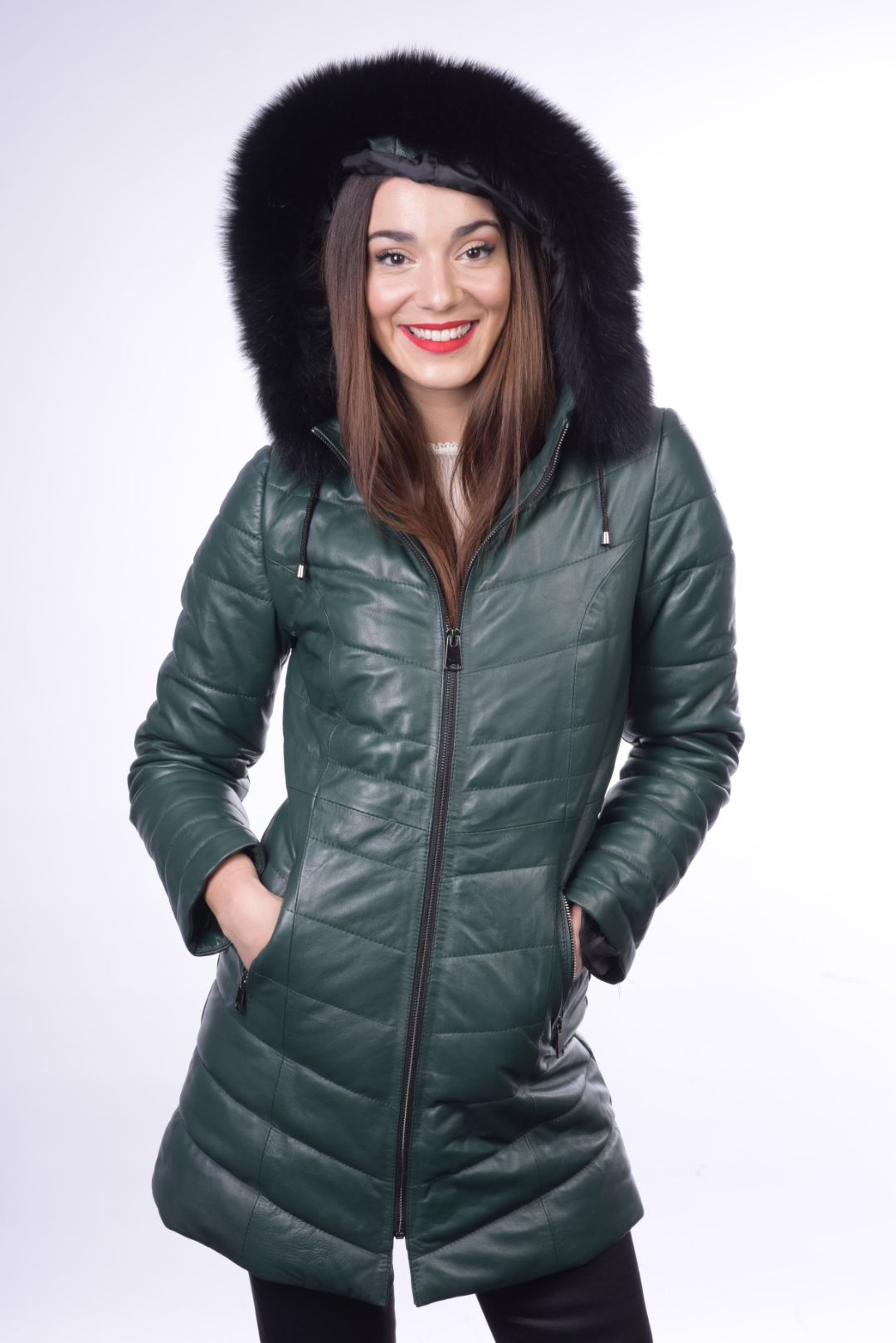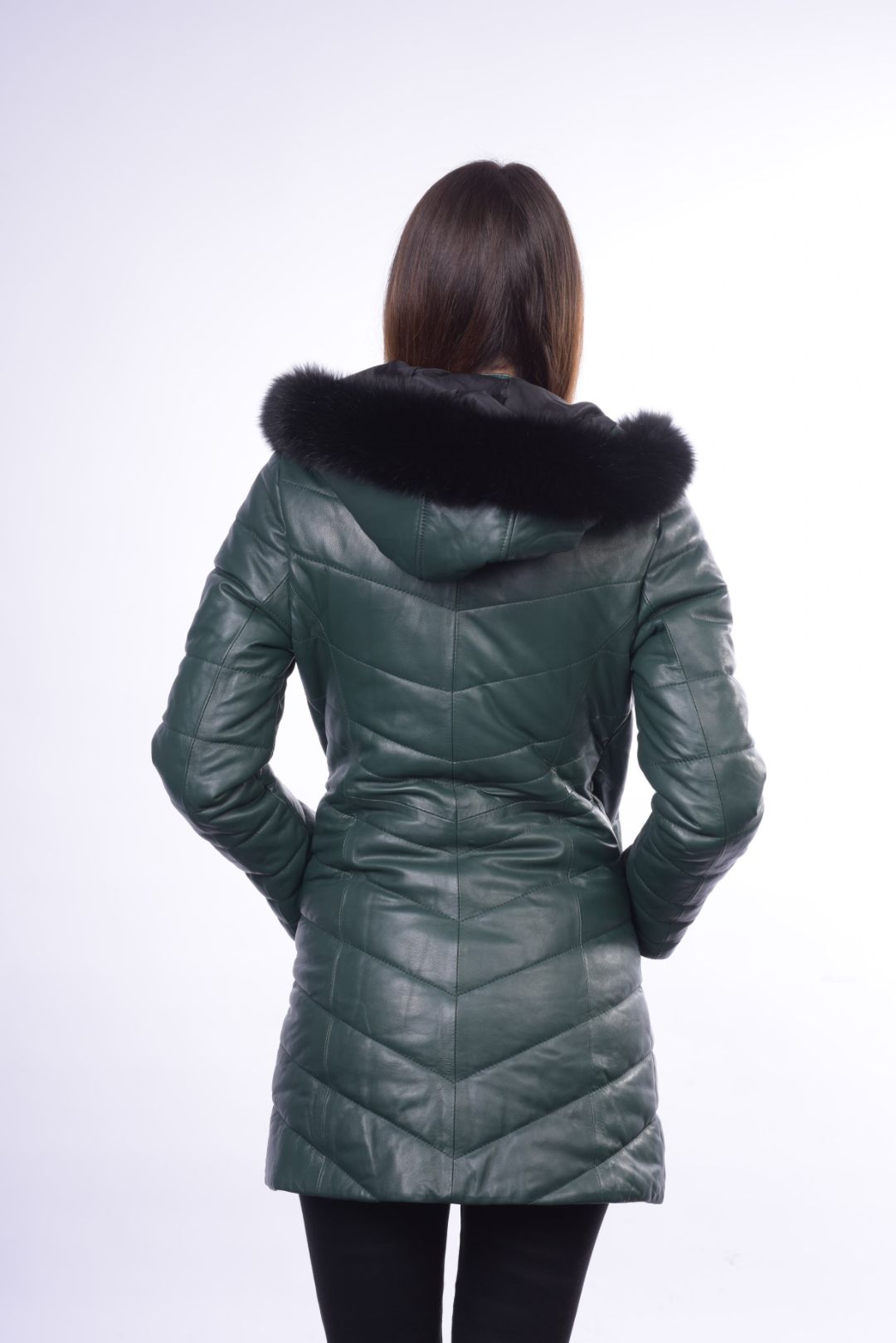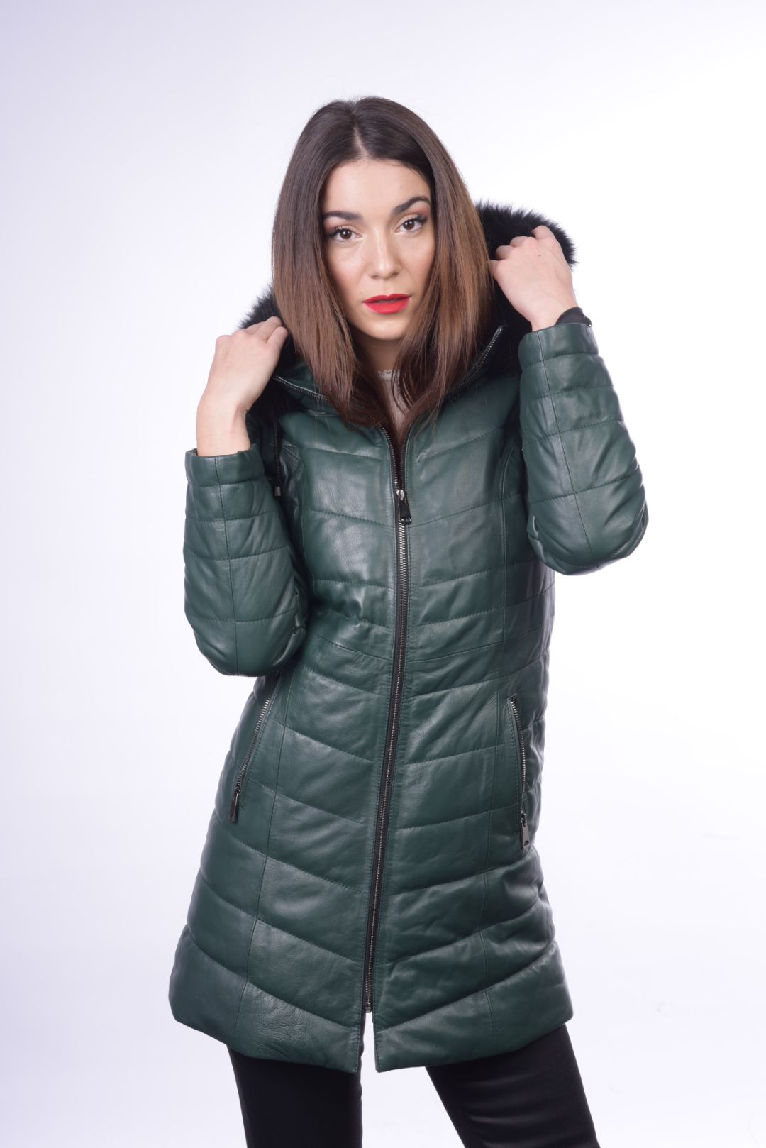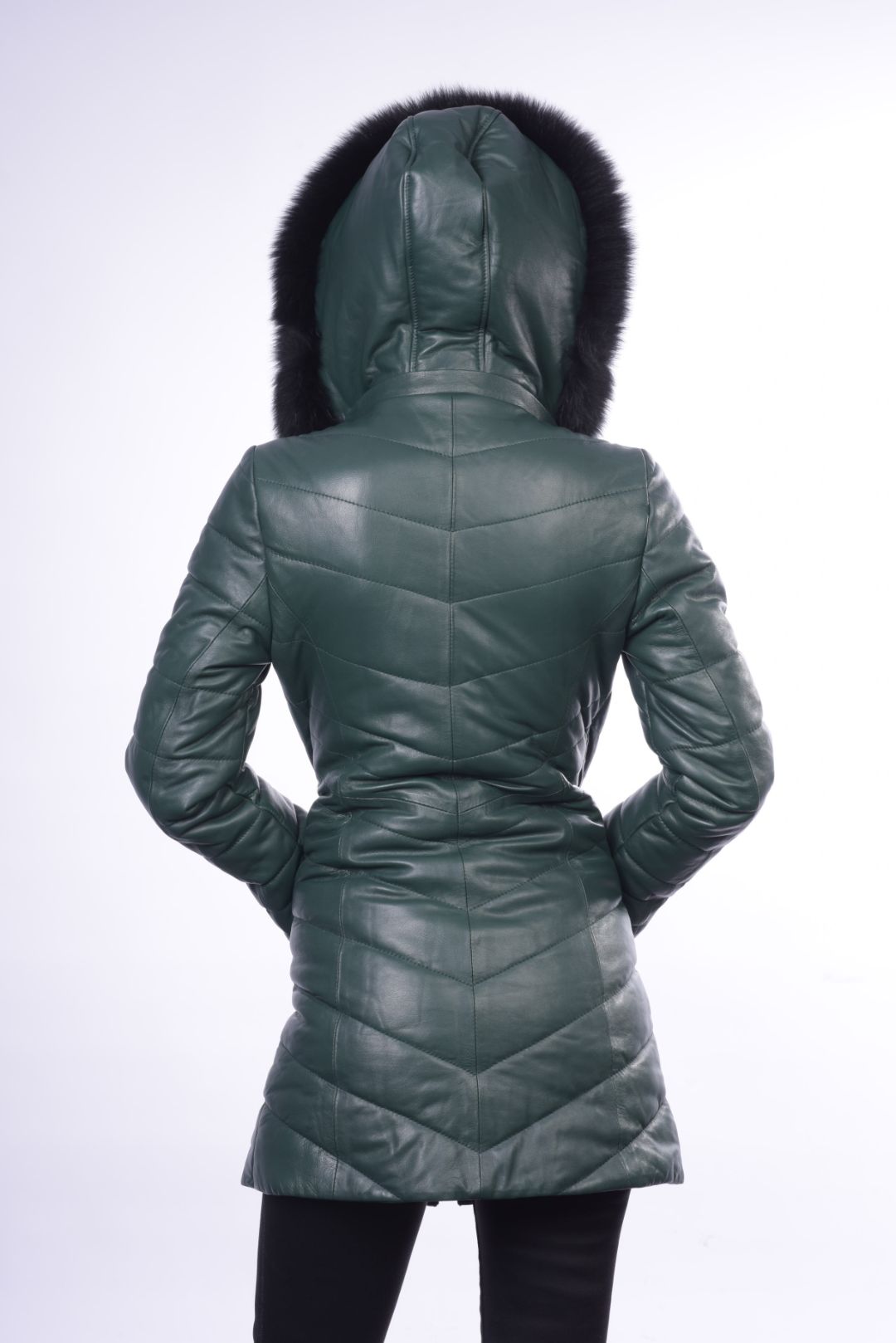 • Προσθαφαιρούμενη δερμάτινη κουκούλα με γούνα αλεπού στον γιακά.
