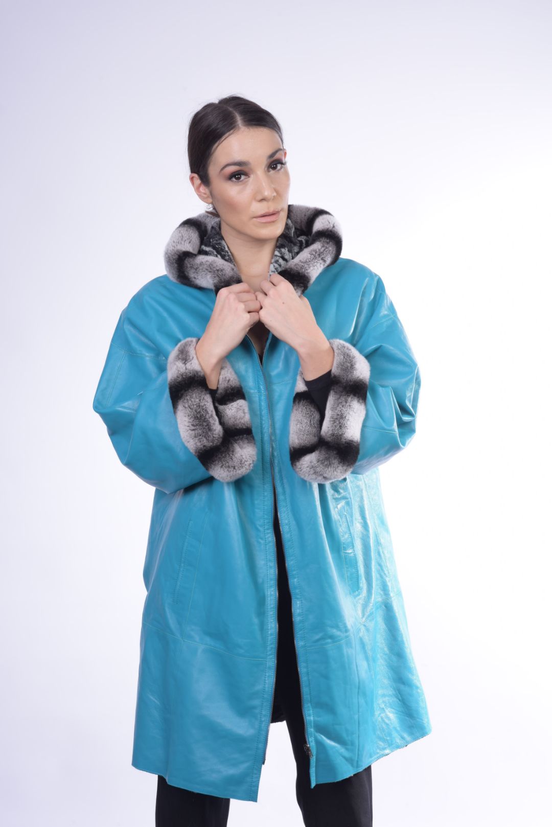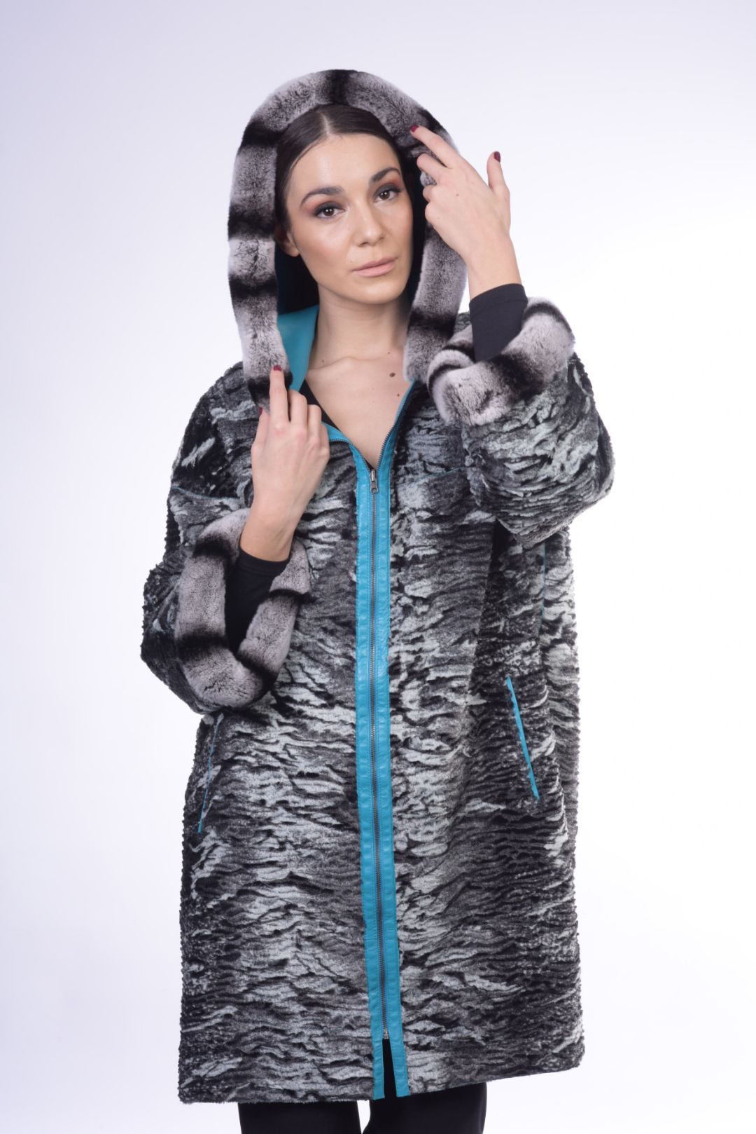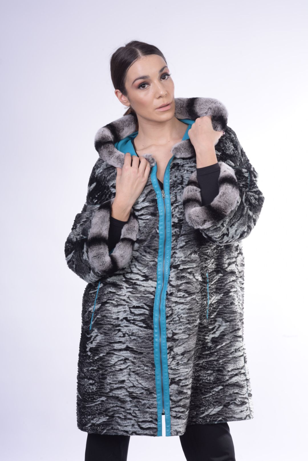 • Γούνα τσιντσιλά περιμετρικά της κουκούλας και των μανικιών.