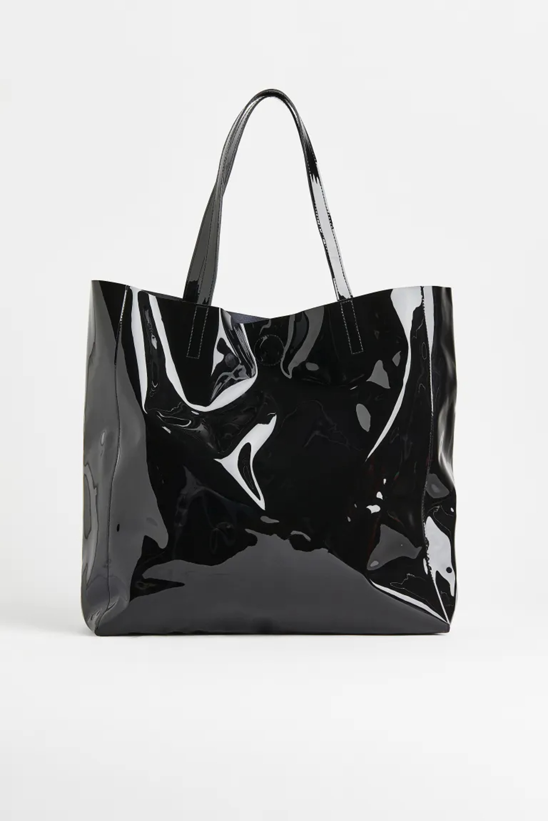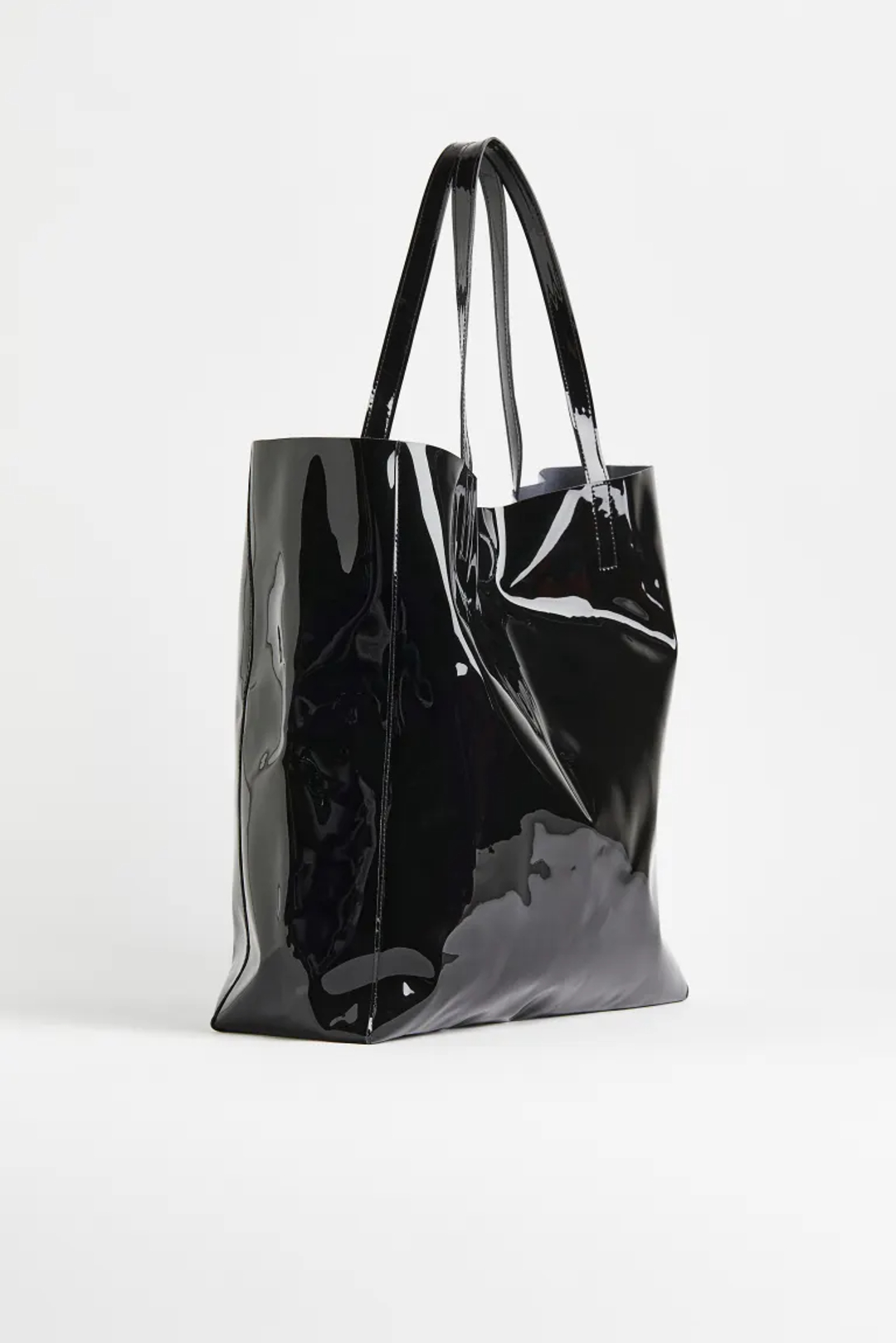 Γυναικεία μαύρη τσάντα shopper από υψηλής ποιότητας γυαλιστερό συνθετικό δέρμα. Αυτή η τσάντα shopper είναι μεσαίου μεγέθους και κλείνει με μαγνητικό κούμπωμα. Υπάρχει μια μεγάλη θήκη και εσωτερική τσέπη με φερμουάρ. Διαθέτει δύο λαβές και μπορεί να κρεμαστεί άνετα στον ώμο.